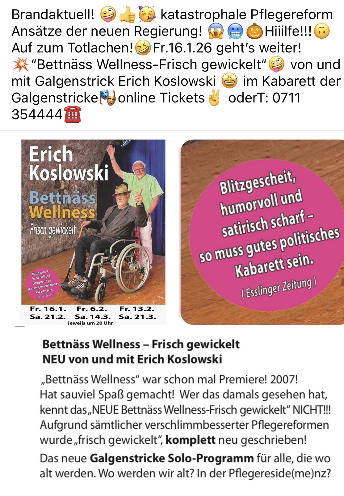 Sonderveranstaltung mit anschliessendem Gespräch zum Thema “Pflegenotstand in Deutschland” im Theatercafe im Kabarett der Galgenstricke, Webergasse 9, 73728 Esslingen, Reservierungen unter 0711 35 44 44